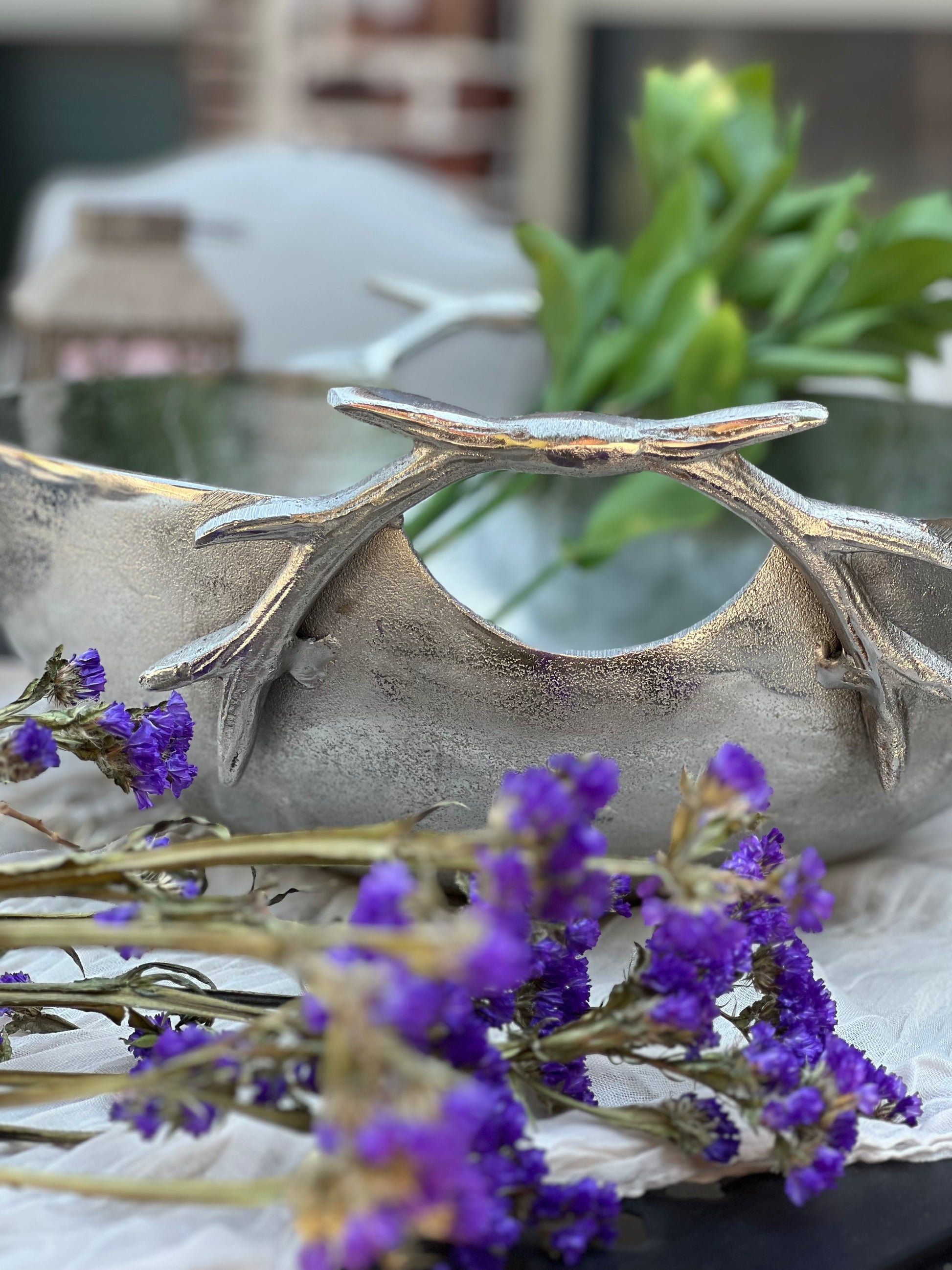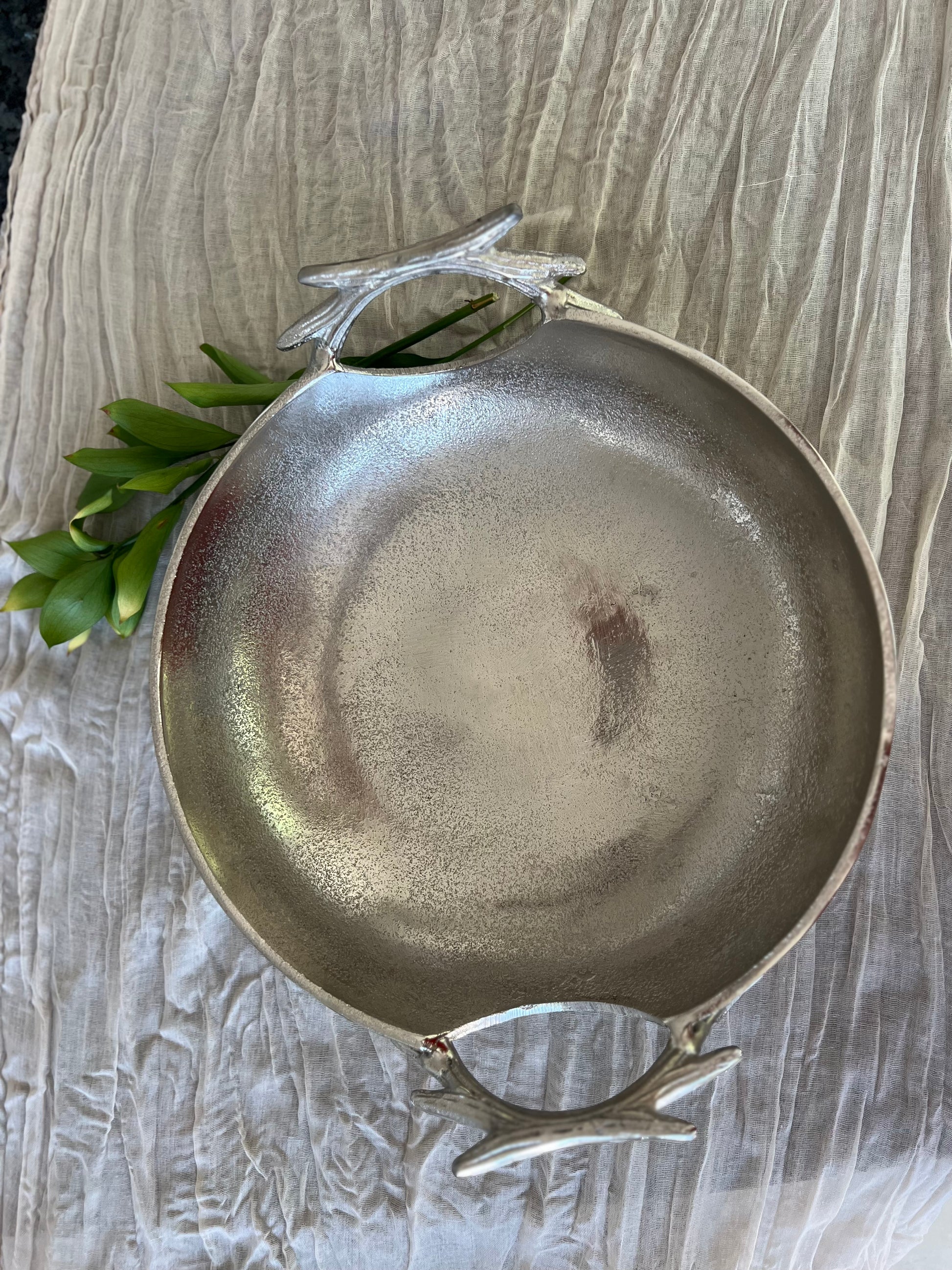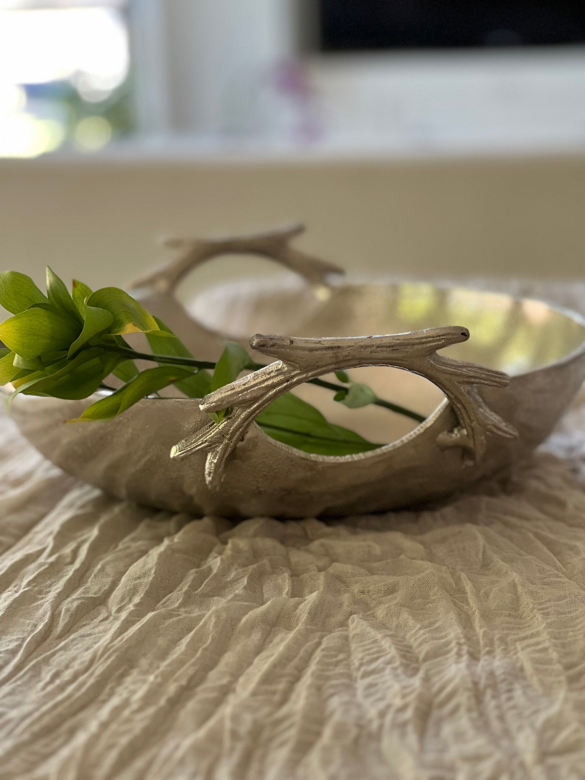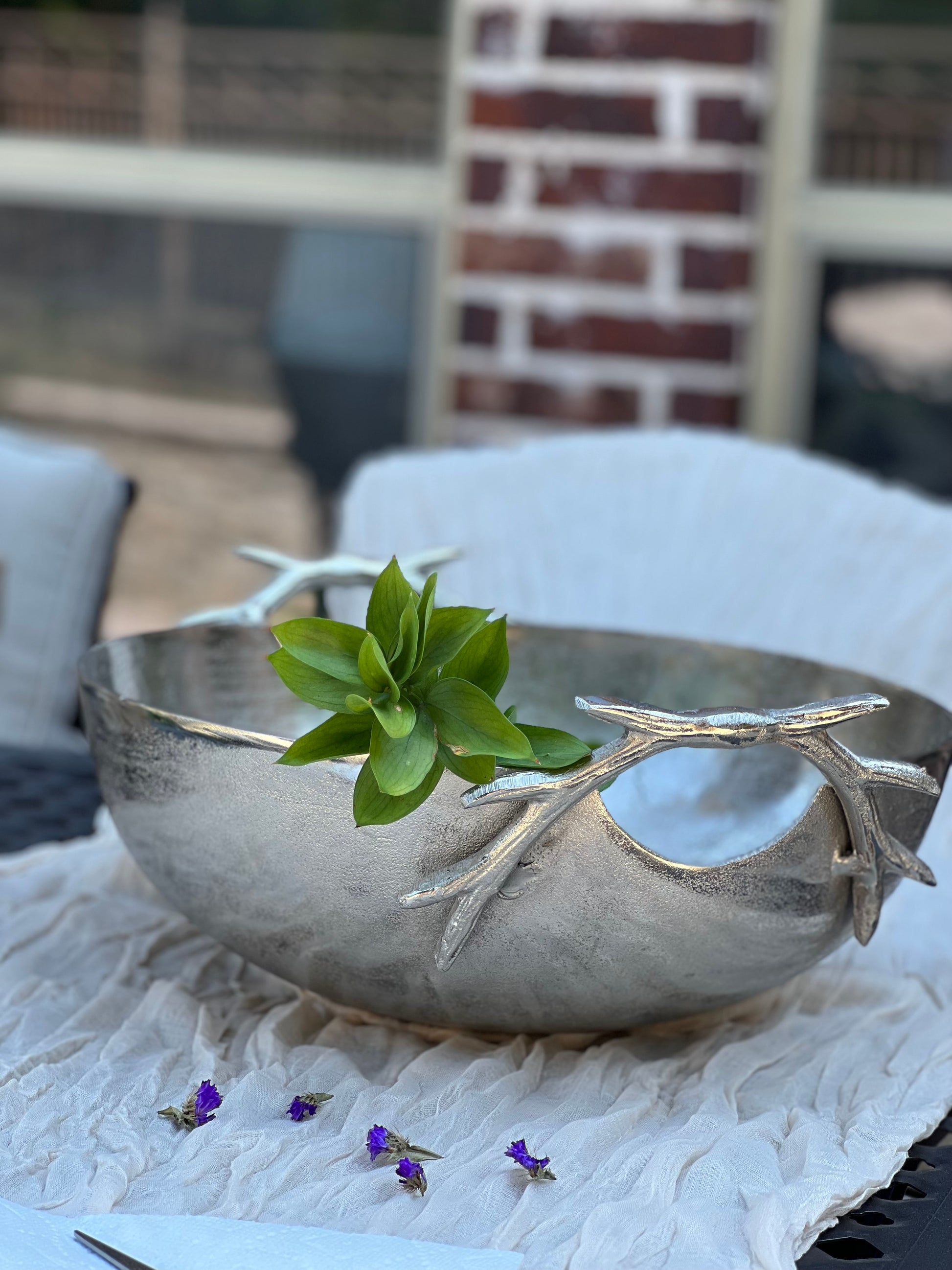 Glossy and gleaming, this bowl will make a gorgeous addition to your home! Filled with fruit, ..., its unique shine and shape is beautifully emphasized by branch around the bowl's edge.